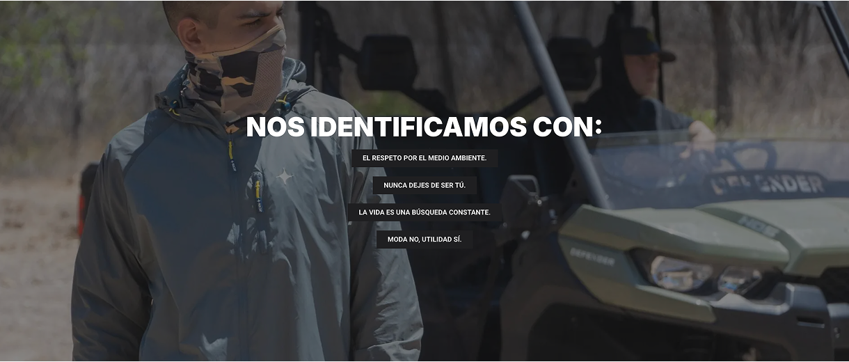 Nuestras prendas y nuestra empresa despiertan el espíritu de aventura, fomentamos el respeto por el mundo natural. Queremos que te veas bien mientras eres tú, aprovechando el uso de la tecnología para la creación de ropa cómoda y útil que contribuya en el desempeño de tus actividades.